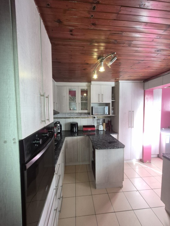 Inside, the residence features a comfortable lounge and a dedicated dining room, both enhanced by unique wooden slatted ceilings and practical tiled flooring. The kitchen is well-appointed with modern light-colored cabinets, dark granite-look countertops, a mosaic tile backsplash, and includes a built-in oven and gas cooktop, providing a functional space for culinary activities.